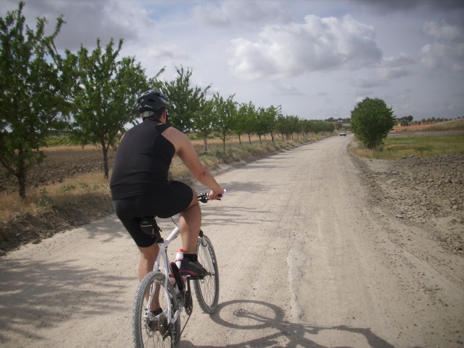Javi nada mas salir de Numancia pone el plato grande y se lanza hacia Yuncler, al dejar el cementerio de Numancia a nuestra derecha comienza una pequeña bajada, el camino no es complicado pero hay bastante tierra y piedras por lo que yo me quedo un poco atrás, en los bancos de arena la bici me hace algún estraño pero sigo, Javi va demasiado rápido...