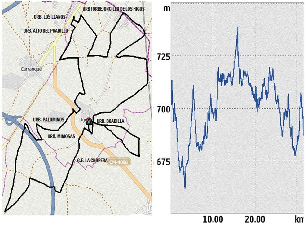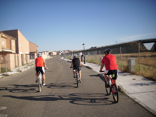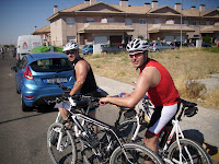 Tras el paso por la Urbanización Los Palominos, Rincón se distancia un poco; Luis me dice "sigue, no te preocupes, es todo corazón", "definitivamente el calor le esta afectando y le ha vuelto un poco lila", pienso. Dicho esto seguimos, atravesando la Urbanización Villarreal, con dirección a Cedillo del Condado. Este tramo, exceptuando algún pequeño repecho, es descendente casi en su totalidad, cambiando radicalmente cuando giramos de nuevo dirección a Ugena, en las proximidades de Cedillo del Condado. Todo lo que habíamos bajado, ahora había que subirlo.