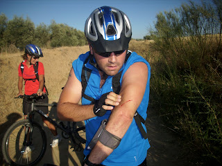 Charla con Miguel sobre ciclismo en carretera y otra vez en ruta, el siguiente hito en el camino era Palomeque. El ritmo era bajo, íbamos relajados, sumergidos en distintas conversaciones cuando ocurrió... ¡biker al suelo! Mori entró en una "roera" que ya no le dejó salir. Cayó en unos zarzales que grabaron su huella en el brazo izquierdo provocando una nueva ocasión para sacar mi vena de paparazzi.