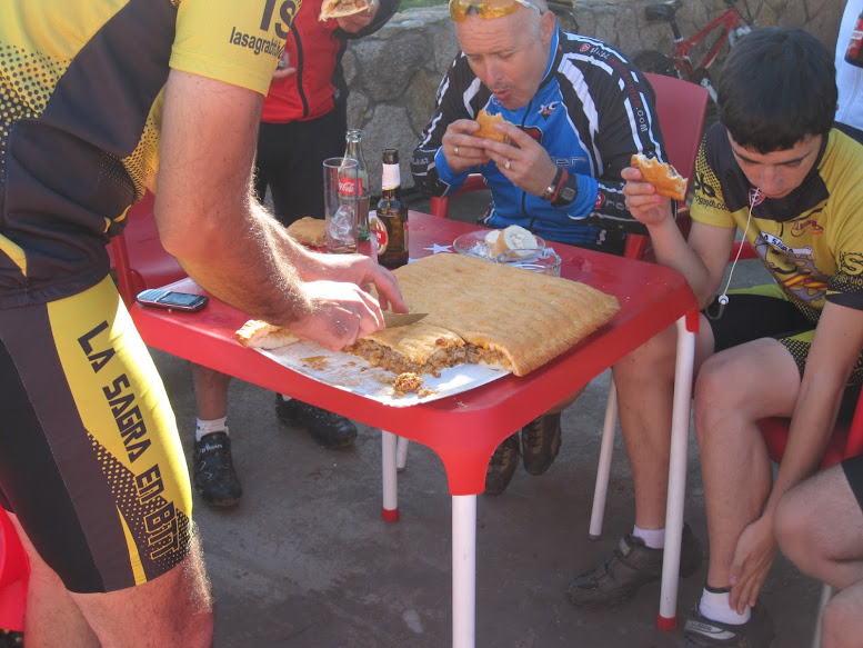 La mesa esta puesta pero el hornazo se retrasa, el queso con pimentón hace amena la espera. Con la segunda ronda de cervezas llega el hornazo recién hecho, calentito, rebosante de carne... todavía se me hace la boca agua.No sé como vamos a volver a Candeleda...