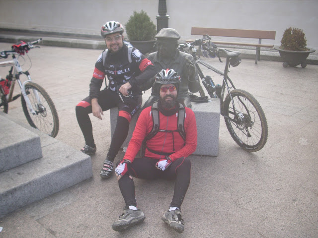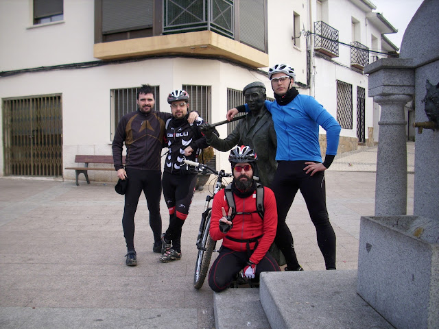 Continuamos hacia nuestro destino, distancia que aprovecho para ir llenando la panza a caraperro. En Valmojado, fotos de relleno en la iglesia y en la plaza del ayuntamiento y camino de vuelta, en el que Luís hace caer a Rincón en un banco de arena (esta bastante torpe desde que va a volver a ser papa).