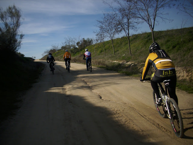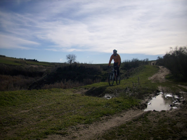Toca el regreso, por fin, hoy no tengo ningún as en la manga para regresar antes que ellos (Luis, pondrá aquí el link de la ruta “Ciudad Imperial”, en la que se narran las malas artes utilizadas por el que suscribe para ahorrarse los kilómetros finales de una dura etapa). Lo primero es la cuesta que Ramiro narra en su crónica de 25º (no la medí, le creo, a simple vista era así: / ). Damián la enfila y justo en el comienzo.... cadena fuera, lo que hace que le adelante por el exterior, quitándole las pegatinas. Unos metros después estamos todos con el pie a tierra, miedo a no sacar la cala a tiempo una vez íbamos perdiendo velocidad. Casi toda la subida la hacemos andando, a excepción de Damián y Rincón, que se animan con la última parte, coronando subidos en la bicicleta.