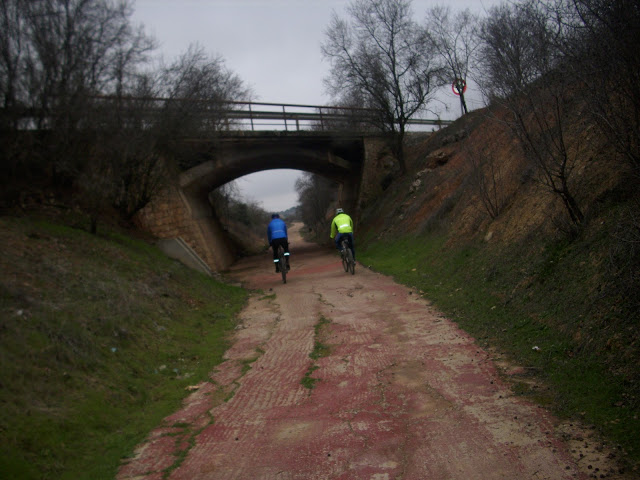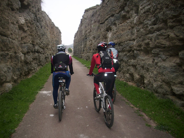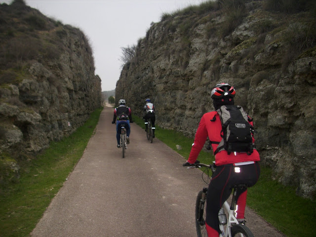 Abandonamos pues la vía del Tajuña que discurre casi llana hasta Ambite a unos 13 kilómetros de la bifurcación. Tomamos el camino hacia el valle del arroyo Carrizales en un fuerte ascenso que me hace perder rueda de los compañeros, no me despego mucho y para mi agrado el camino gira 90º a la derecha y el desnivel se suaviza. Es justo en este punto donde comenzamos a rodar por la antigua vía de los 40 días. Nos reagrupamos, me esperan, aunque prefiero pensar que soy yo quien les da alcance (en este deporte es tan importante sentirse fuerte como estar fuerte y en muchas ocasiones hay que saber sufrir). Pasamos las primeras trincheras excavadas en la roca para el paso de las vías, las más espectaculares de toda la ruta y seguimos ascendiendo kilómetro tras kilómetro hasta llegar al noveno de esta vía (el 23 de nuestra ruta) donde alcanzamos la divisoria de aguas entre olivares y comenzamos a bajar hacia Estremera ya en el valle del Tajo.