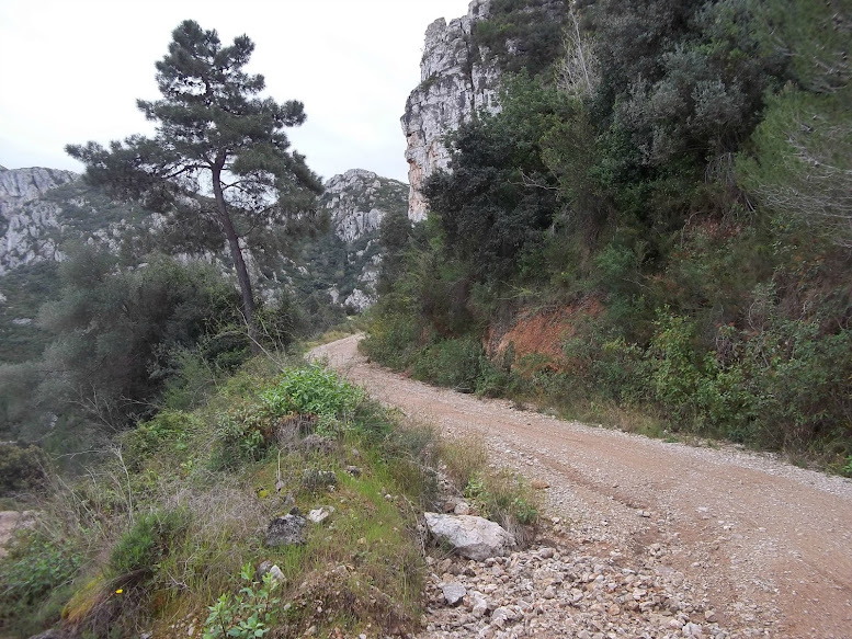 Sin quererlo, porque debíamos haber aparecido en Quatretonda, en algún lugar debimos perder un desvío y la confusión nos iba a significar 15 kilómetros de regalo que se añadían al castigo que nos había infligido la Ombria del Buixcairró. De Pinet bajamos a Lluntxent por la carretera recién asfaltada y con cunetas más que generosas que nos daban sensación de seguridad ante el escaso tráfico rodado. En Lluntxent hacemos otra rápida parada para descansar unos minutos las piernas y seguimos ruta hacia La Pobla del Duc efectivamente entre tierras blancas y frutales, pero apenas sin naranjos. Vamos por terreno “llano” y en cada subida nos va costando más y más mantener el ritmo, nos llueve un poco, lo justo para no llegar a empaparnos, sólo un pequeño inconveniente de cinco minutos.